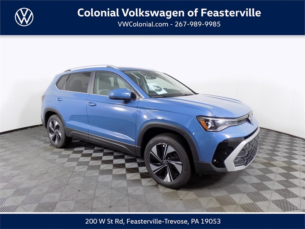 2025 Monterey Blue Pearl Volkswagen Taos 1.5T SE Check out all these great option's 4-Wheel Disc Brakes, 6 Speakers, ABS brakes, Active Blind Spot Monitor, Air Conditioning, Alloy wheels, AM/FM radio: SiriusXM with 360L, Auto High-beam Headlights, Automatic temperature control, Brake assist, Bumpers: body-color, CloudTex & Cloth Seating Surfaces, Compass, Delay-off headlights, Driver door bin, Driver vanity mirror, Dual front impact airbags, Dual front side impact airbags, Electronic Stability Control, Emergency communication system: VW Car-Net Safe & Secure 5-year, Exterior Parking Camera Rear, Four wheel independent suspension, Front anti-roll bar, Front Bucket Seats, Front Center Armrest, Front dual zone A/C, Front reading lights, Front Strut Rear Multi-Link Suspension, Fully automatic headlights, Heated door mirrors, Heated Front Bucket Seats, Heated front seats, Heated steering wheel, Illuminated entry, Leather Shift Knob, Low tire pressure warning, Occupant sensing airbag, Outside temperature display, Overhead airbag, Overhead console, Panic alarm, Passenger door bin, Passenger vanity mirror, Power door mirrors, Power driver seat, Power steering, Power windows, Radio data system, Radio: MIB3 Composition Media AM/FM/HD, Rain sensing wipers, Rear anti-roll bar, Rear seat center armrest, Rear Spoiler, Rear window defroster, Rear window wiper, Remote keyless entry, Security system, Speed control, Speed-sensing steering, Split folding rear seat, Steering wheel mounted audio controls, Tachometer, Telescoping steering wheel, Tilt steering wheel, Traction control, Trip computer, Variably intermittent wipers, and Wheels: 18" 2-Tone Machined Alloy CALL NOW 877-483-6331!! ##### Delivering the Best Customer Experience is our #1 GOAL! Colonial Volkswagen is proud to offer only the finest automobiles. Price excludes sales Tax, tags, registration, title, doc fee & tire tax. *Prior sales excluded and Internet pricing cannot be combined with VW Credit's Special APR rates. Final price includes all applicable discounts for qualifying customers. Price may change depending on credit qualification criteria. While every reasonable effort is made to ensure the accuracy of this information, we are not responsible for any errors or omissions contained on these pages. Please verify any information in question with Colonial Volkswagen. Colonial Volkswagen, 200 W. Street Rd. Feasterville, PA, 19053. Visit us and Experience the Difference here at Colonial VW! CALL NOW 877-483-6331. 25/33 City/Highway MPG Price does not include tax, title, motor vehicle fees. Price includes all eligible dealer discounts and manufacturer incentives, not all customers may qualify. Certain restrictions apply, please see dealer for details. $500 - Retail Customer Bonus. Exp. 11/03/2025