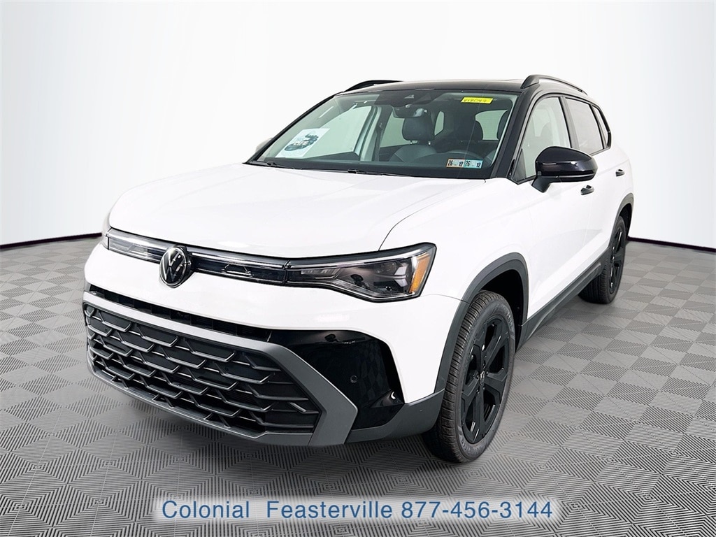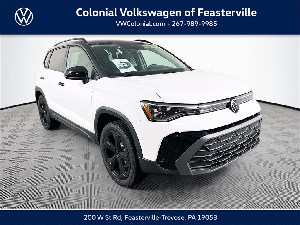 2026 Pure White w/Deep Blk Rf Volkswagen Taos 1.5T SE Black Check out all these great option's 4-Wheel Disc Brakes, 6 Speakers, ABS brakes, Active Blind Spot Monitor, Air Conditioning, Alloy wheels, AM/FM radio: SiriusXM with 360L, Auto High-beam Headlights, Automatic temperature control, Brake assist, Bumpers: body-color, Cloudtex and Cloth Seating Surfaces, Compass, Delay-off headlights, Driver door bin, Driver vanity mirror, Dual front impact airbags, Dual front side impact airbags, Electronic Stability Control, Emergency communication system: VW Car-Net Safe & Secure 5-year, Exterior Parking Camera Rear, Four wheel independent suspension, Front anti-roll bar, Front Bucket Seats, Front Center Armrest, Front dual zone A/C, Front reading lights, Front Strut Rear Multi-Link Suspension, Fully automatic headlights, Heated door mirrors, Heated Front Bucket Seats, Heated front seats, Heated steering wheel, Illuminated entry, Leather Shift Knob, Low tire pressure warning, Occupant sensing airbag, Outside temperature display, Overhead airbag, Overhead console, Panic alarm, Passenger door bin, Passenger vanity mirror, Power door mirrors, Power driver seat, Power steering, Power Tilting & Sliding Panoramic Sunroof, Power windows, Radio data system, Radio: MIB3 Composition Media AM/FM/HD, Rain sensing wipers, Rear anti-roll bar, Rear seat center armrest, Rear Spoiler, Rear window defroster, Rear window wiper, Remote keyless entry, Security system, Speed control, Speed-sensing steering, Split folding rear seat, Steering wheel mounted audio controls, Tachometer, Telescoping steering wheel, Tilt steering wheel, Traction control, Trip computer, Variably intermittent wipers, and Wheels: 19" Black Painted Alloy CALL NOW 877-483-6331!! ##### Delivering the Best Customer Experience is our #1 GOAL! Colonial Volkswagen is proud to offer only the finest automobiles. Price excludes sales Tax, tags, registration, title, doc fee & tire tax. *Prior sales excluded and Internet pricing cannot be combined with VW Credit's Special APR rates. Final price includes all applicable discounts for qualifying customers. Price may change depending on credit qualification criteria. While every reasonable effort is made to ensure the accuracy of this information, we are not responsible for any errors or omissions contained on these pages. Please verify any information in question with Colonial Volkswagen. Colonial Volkswagen, 200 W. Street Rd. Feasterville, PA, 19053. Visit us and Experience the Difference here at Colonial VW! CALL NOW 877-483-6331."Advertised Best Cash Price represents the dealershipâs lowest available price and is offered in place of all other manufacturer or dealer incentives, rebates, special interest rates, or promotional offers. Offers may not be combined." 25/33 City/Highway MPG Price does not include tax, title, motor vehicle fees. Price includes all eligible dealer discounts and manufacturer incentives, not all customers may qualify. Certain restrictions apply, please see dealer for details. $500 - Customer Bonus. Exp. 02/02/2026